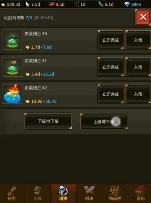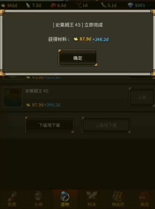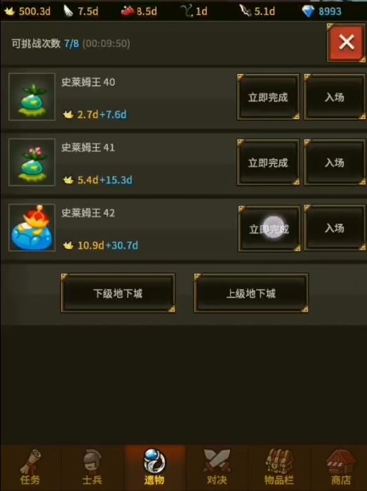 4.点确定领取完奖励后,点一下 下级地下城,然后再点一下 上级地下城,切换一下页面,领取奖励的那个关卡就可以立即完成了.如此反复,就可以无视强化等级,刷到后面的关卡,刷到大量的材料,再也不用担心材料不够用了.