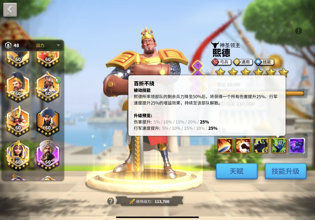 在所率领部队低于血线后触发的状态系技能,提升部队造成所有伤害,同时并提升部队行军速度,主要用于加强熙德输出续航以不至于断档的救场技能;在兵力大量损耗的情况下,熙德依然能够打出平滑伤害,补强自身持续伤害弥补自身输出能力缺陷非常适合平均血线低于健康值野外战场,亦或是对据点攻坚作战!