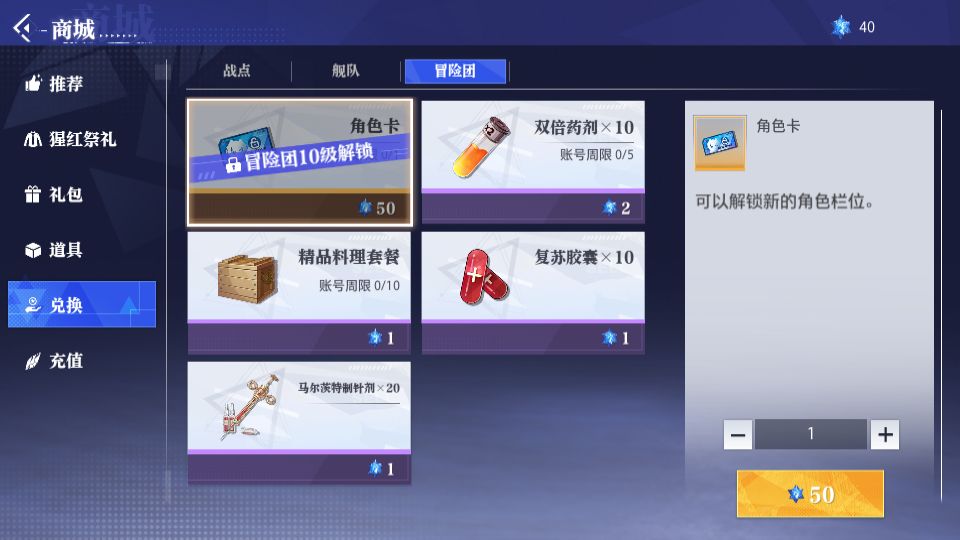 冒险团商城兑换(10级开放第五个栏位)