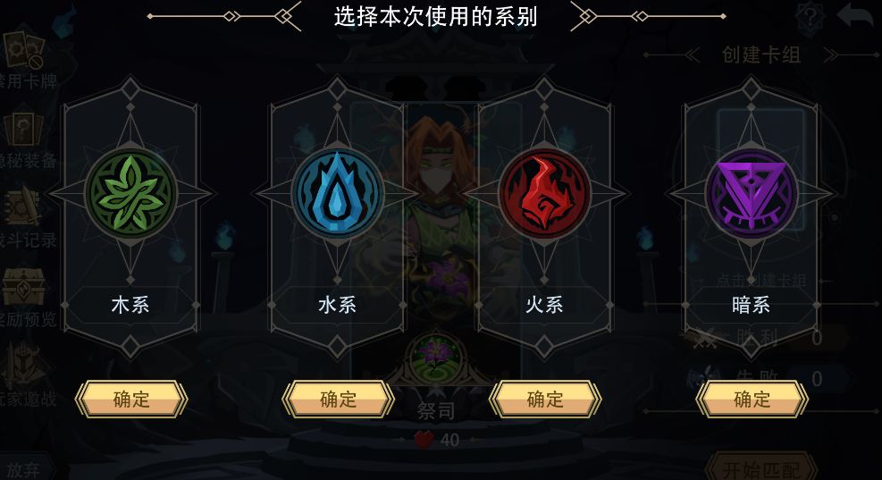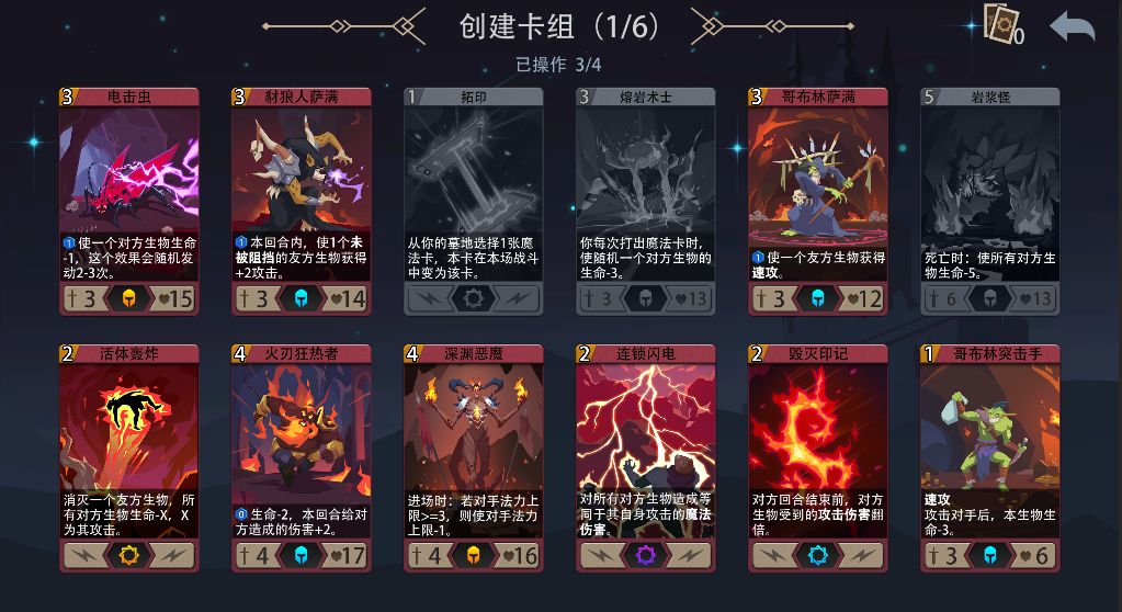 玩家先选择系别,再进行6次12选4,完成自己的卡组。