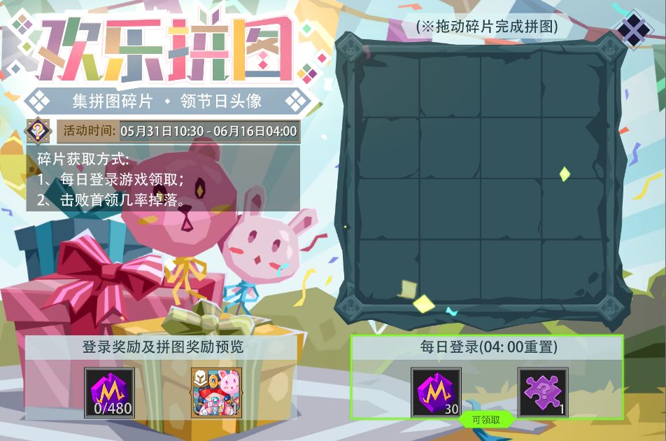 活动内容:节日来临,茹卡换上欢乐套装。活动期间,每日登录游戏可领取魔晶及随机拼图碎片奖励。另外,在(冒险模式/冒险试炼场/梦魇模式)下击败首领也有几率掉落拼图碎片。集齐所有拼图碎片并拼凑完整,还可以获得“限定儿童节头像”[童心茹卡]。