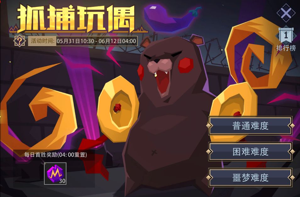活动内容:节日来临,玩偶失去控制,四处乱窜,需要您合理放置陷阱将其捕获。游戏分为普通、困难、噩梦三种难度,无论哪种难度下进行游戏,只要每日首次胜利即可获得奖励;次日凌晨04:00刷新。“抓捕成功“才有机会进入排行榜,按照难度和步数进行排名。