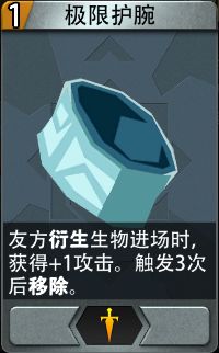※极限护腕:特殊装备卡,友方衍生生物进场时,获得+1攻击。触发3次后移除。