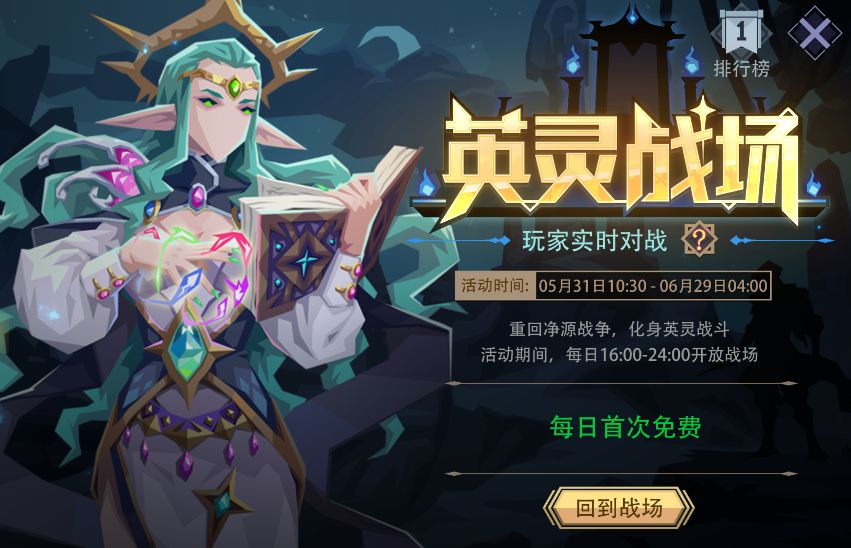 活动内容:活动期间,可进入英灵战场,化身各种英雄与其他玩家进行实时对战,每日免费4次。免费次数为0时,可以花费魔晶购买次数,每日最多10次;每日04:00重置。