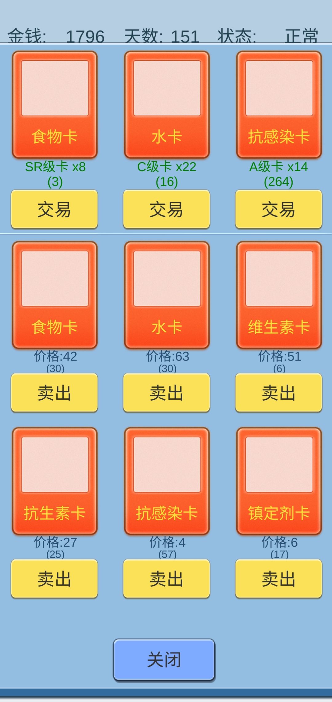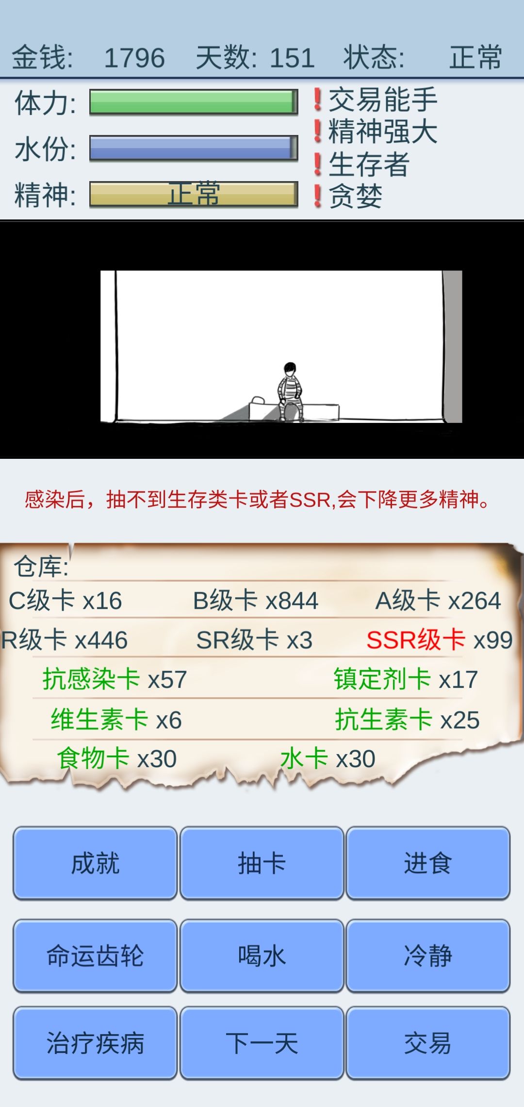 而且这还是我把水卡的数量保持在30的情况下,因为我的命运齿轮点的水卡概率增高,加上生存者,所以水卡的出货率很高,再加上维生素卡和食物卡,还可以用其他卡来换食物卡和水卡,所以完全不担心金钱问题。