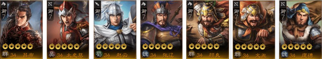 7御推荐武将较多,都是一些强力的物理大C,其中比较推荐的有颜良、文丑、张辽,颜良和文丑自带控制,而张辽则是自带高额伤害突击+先攻。