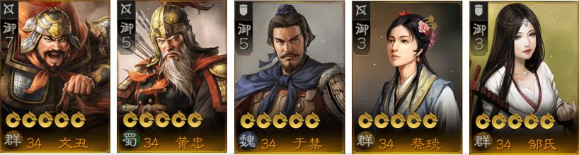 文丑(乘间击瑕),黄忠(裸衣血战),邹氏(传檄宣威),于禁(固若金汤),蔡琰(刮骨疗毒/权时救急)