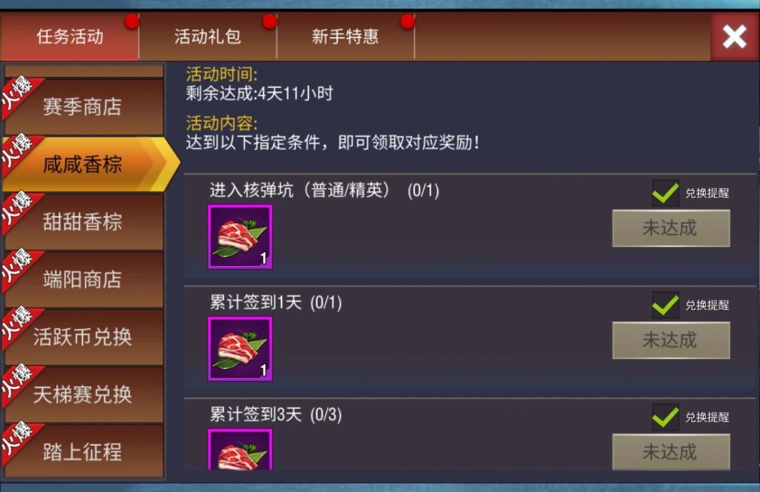 活动期间,完成任务即可获得【腌肉】,集齐一定数量道具可获得【粽叶】并在兑换活动中领取相应奖励,更有可能获得多张强力橙色科技卡!