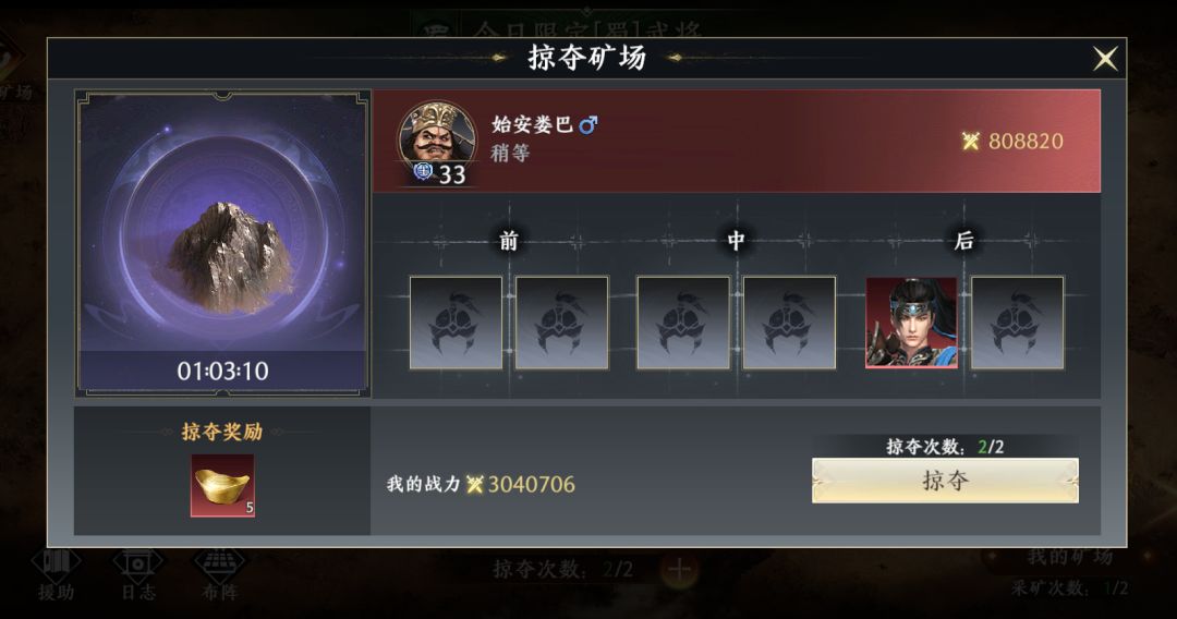 玩家共可派遣三军开启战斗,并在采矿前分别选择三军的主副将,利用交换养成功能,玩家可将阵容中已上阵的内容 (装备、武将进阶与等级、坐骑、宝物) 在不同号位间互换。阵容确定后,点击“我的矿场”即可开始采集资源。