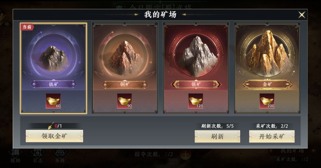 在“我的矿场”中,玩家会被随机分配到铁矿、铜矿、银矿、金矿等不同品质的矿场,根据品质的不同,其采集收益和掠夺奖励也会根据品质有所差别,若当前矿场非所想要的矿场,可以通过刷新键重新选择。