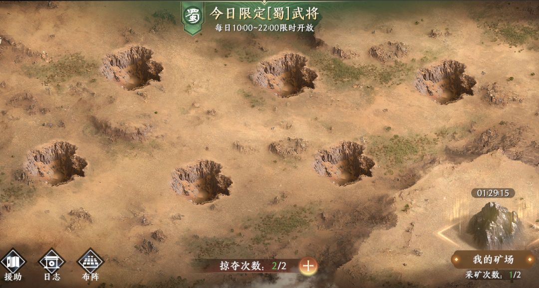 「矿藏掠夺」是全新的PVP玩法,一般会在每日10:00~22:00开放,在该玩法中,玩家需组建强大的各国武将阵容,在矿场中采集资源,并抢夺对手的矿场资源!被抢夺的玩家可以请求友军协助一同反击对手,夺回自己的资源。
