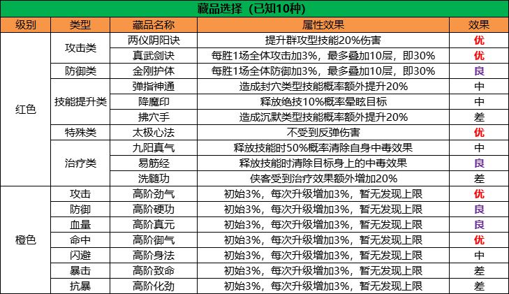 3、每通关一层可获得藏品属性加成,蓝<紫<橙<红,红色为极品属性,且同属性藏品可升级且收益可观,或刷新变成同品质的属性,如橙刷新只出橙,红刷新只出红,常规橙色以下%技能为:攻击、防御、气血、命中、闪避、暴击、抗暴等;其中目前已知属性分布如下: