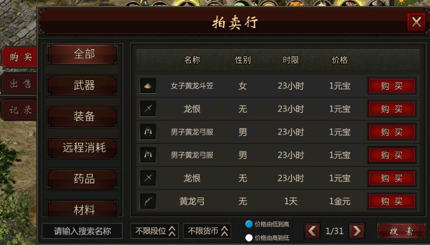 二就是交易行了,而且这游戏的交易行是没有限制的,没有什么等级(要做完新手任务来到长城以南)、特权的要求,虽然不能摆摊一对一交易,但是商量好一个特定的价还是可以卖给特定的人。据之前一个加我搬砖的说,一区刚开区的时候一件黄龙150,物价真的是非常夸张的。下面是开区三天的二区的拍卖行物价。一件黄龙出去月卡就回本了。