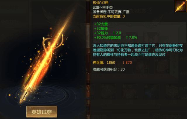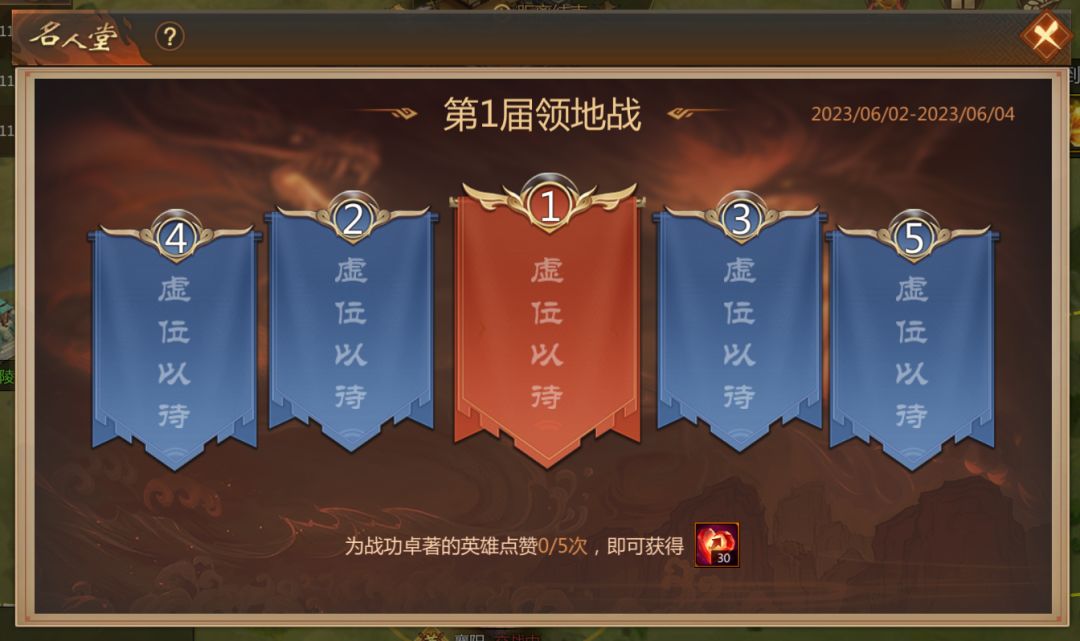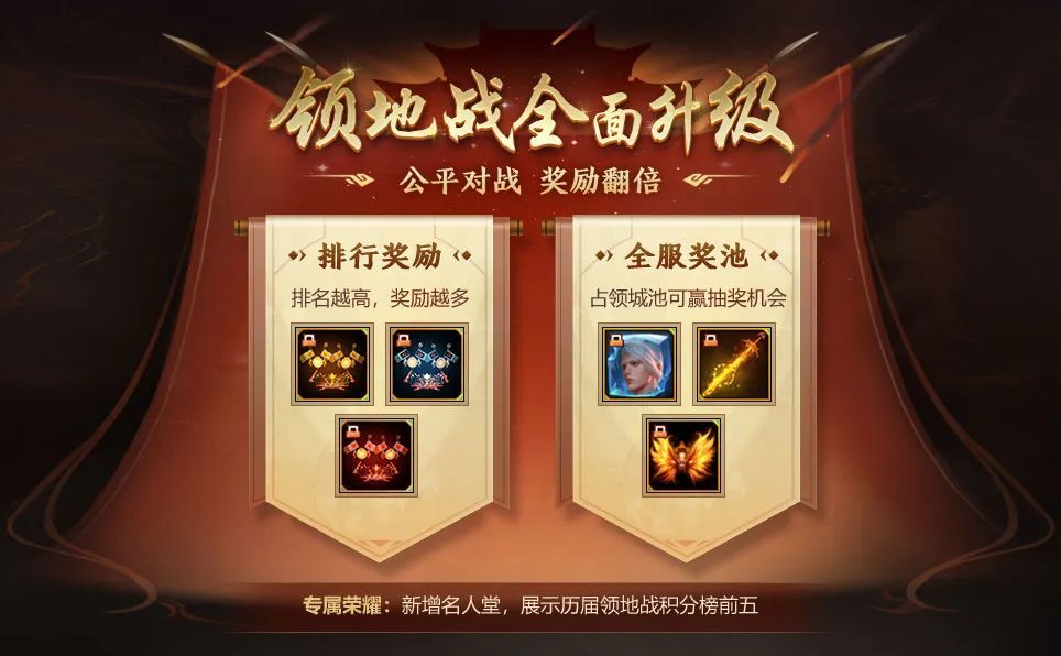 1、领地战结束后全服领地战积分最高的5名玩家将进入名人堂展示