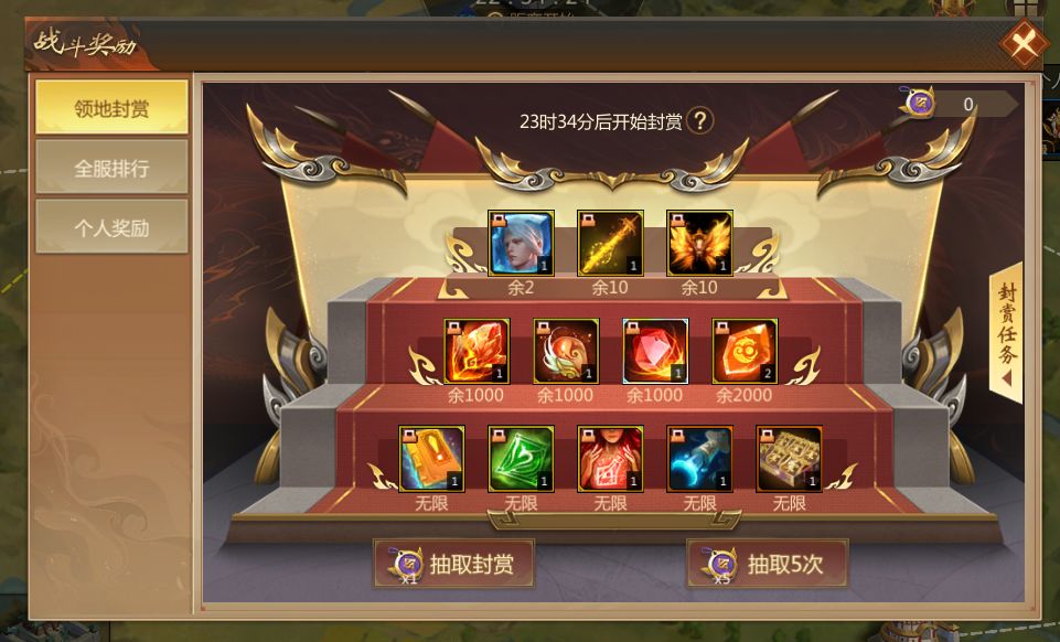 3、领地封赏为全服共享奖池,不同奖励有不同的全服数量限制,先到先得,余量为0后将无法获得