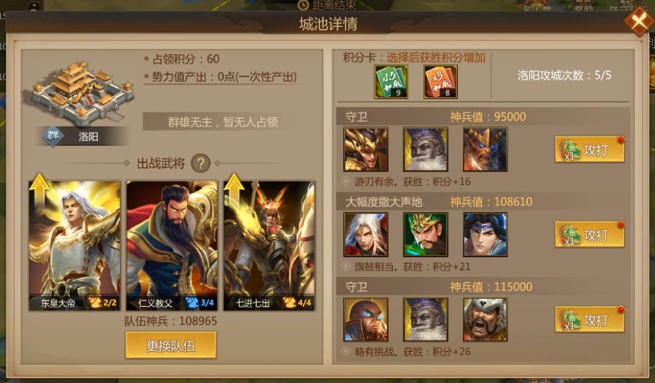 使用不同的积分卡可在单次进攻后获得积分加成,积分卡由攻打洛阳掉落。攻打守军获得的积分,会等价换算为该城池的占领积分。