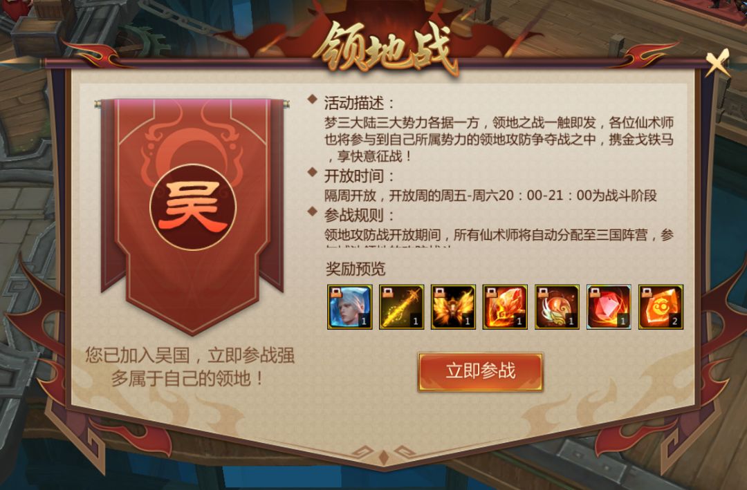 领地战是全服参与的城池策略对战玩法,领地攻防战开放期间,所有仙术师将自动分配至三国阵营,参与城池领地的攻防战斗