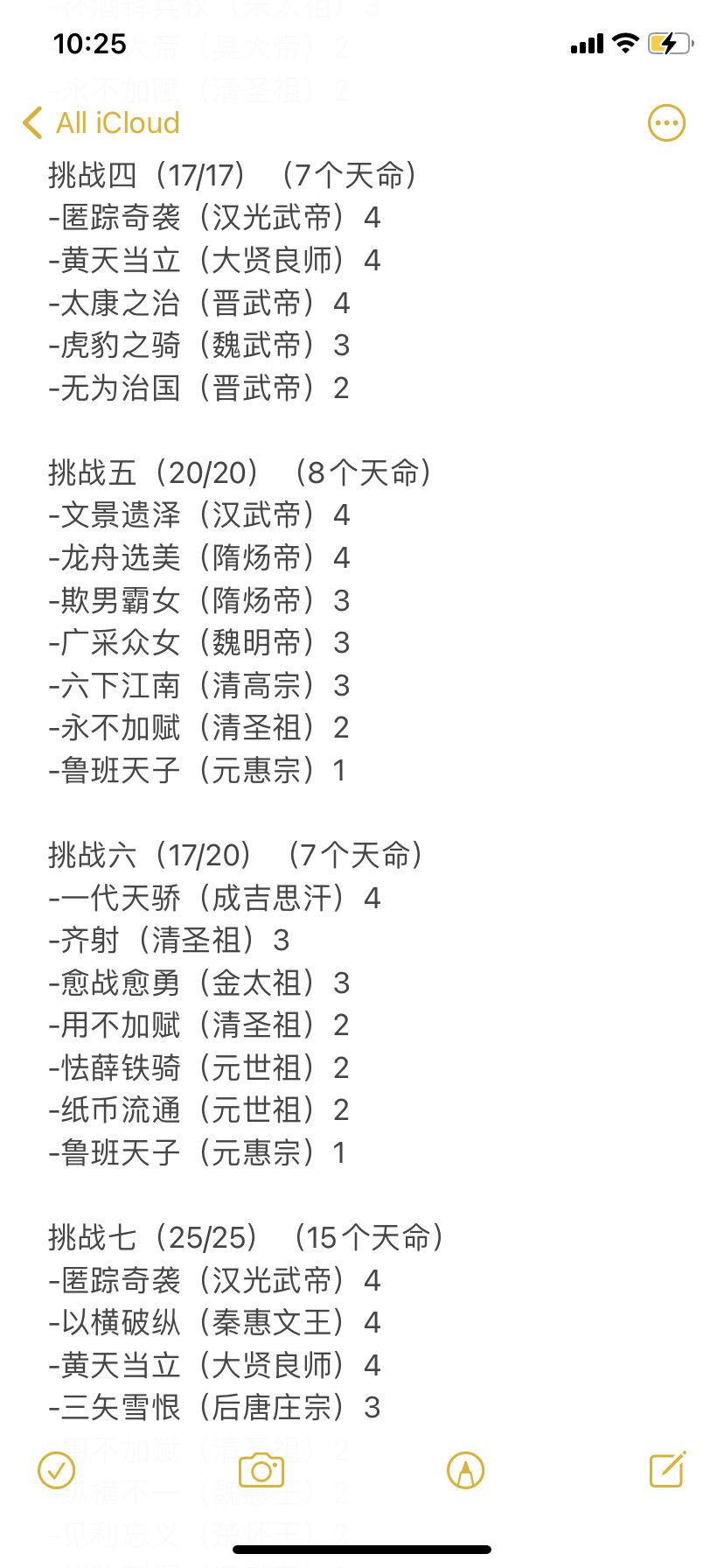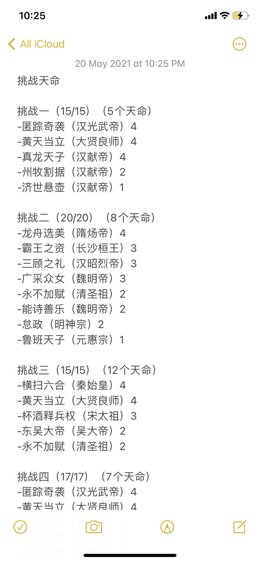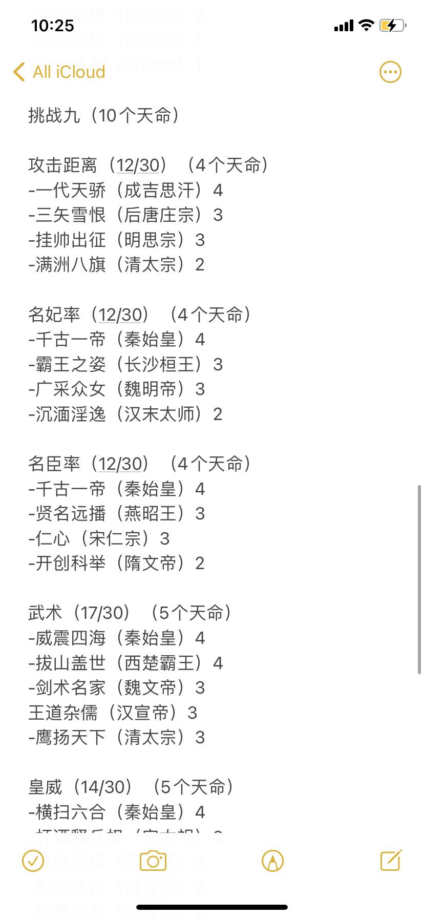 注意:我过挑战一到六时还没全帝卡,但大部分帝卡都有了,当时众里寻她也没有,所以肯定有比我的天命更适合的。(如挑战六的经济天命可以用万国来朝来代替)挑战七全帝卡了,挑战八全卡了,只是没有点兵,挑战九点兵氪出来了。当然,现在有些新天命可以代替以上的天命,如董卓的后宫天命等等。挑战我就是用这些天命过的,只要操作没失误,肯定行的。如果还有不懂的话,可以问我(*^__^*)