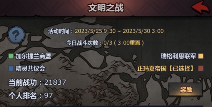 本老萌新第一次参加文明,用的是雷主(主c)+剑圣+突击天启(临时拉的)+2飞鹰+激励主教,在玛夏排97,保守估计在哪个阵营拿前200奖励都ok,作为萌新一次就能实现魂自由+可观龙魂石 黄辉月+部分装备,文明还是性价比很高的活动,把自己的经验整理出来给还没玩过的萌新参考一下,勇敢冲文明。