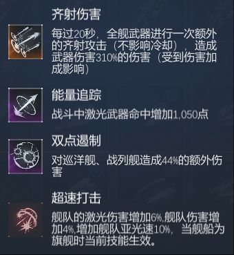 旗舰技能④:旗舰技能增加舰队激光伤害6%,舰队伤害4%,若是使用激光武器,增幅达到10%