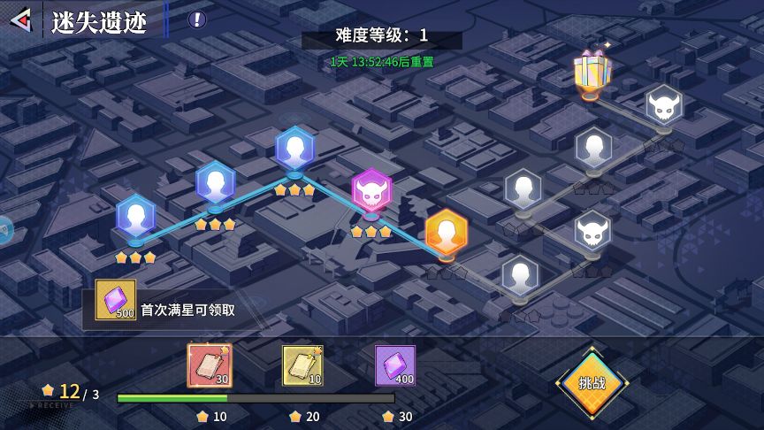 迷失遗迹每2天重置一次,会重置所有关卡和奖励,重置后如果上一轮达到30星,则本轮难度提升,否则难度保持不变,难度等级越高,获得的奖励越丰厚。