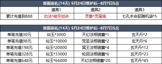 一、维护内容1、游戏内新增:节日法宝*金竺符笔2、888充值豪礼:活动期间内如不需要道具3:可联系客服兑换《仙魔灵宝*50》、雷师叔、紫妍、欧阳倩、冉遗鱼、蓝思、煞魂术、八孔单异能胚子其中1个。3、2000充值豪礼:活动期间内如不需要道具3:可联系客服兑换《仙魔灵宝*100》、灰太狼、哮天犬、猩红魔蛛、化龙诀、兽神诀、鲲鹏、鸾鸟、驳、驳、玉兔、血神诀、上古丹书、太阴鬼典、五雷天书、赵千颖、八孔双异能胚子其中1个。4、充值满4000、6000、8000、10000以此类推,可再申请一份2000档位奖励;4000(申请1份)、6000(申请2份)、8000(申请3分)以此类推兔、血神诀、上古丹书、太阴鬼典、五雷天书、赵千颖、八孔双异能胚子其中1个。