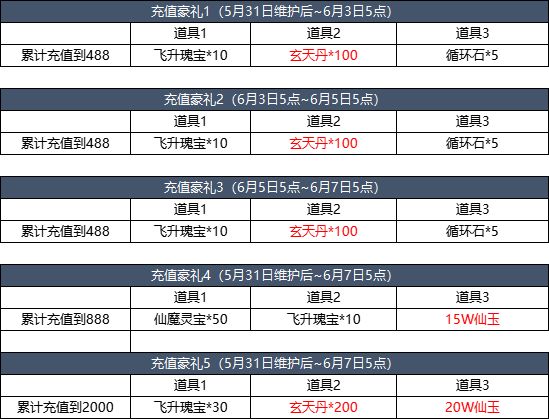 五、充值豪礼【活动名称】充值豪礼【活动时间】5月31日维护后~6月3日5点【活动简介】活动期间累计充值达到指定金额即可领取惊喜礼包!