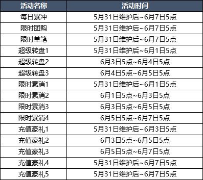 【活动名称】限时单笔充值【活动时间】5月31日维护后~6月7日5点【活动简介】活动期间内,单笔一次性充值指定的对应档位可领取以下奖励!在活动期间内可多次参与。