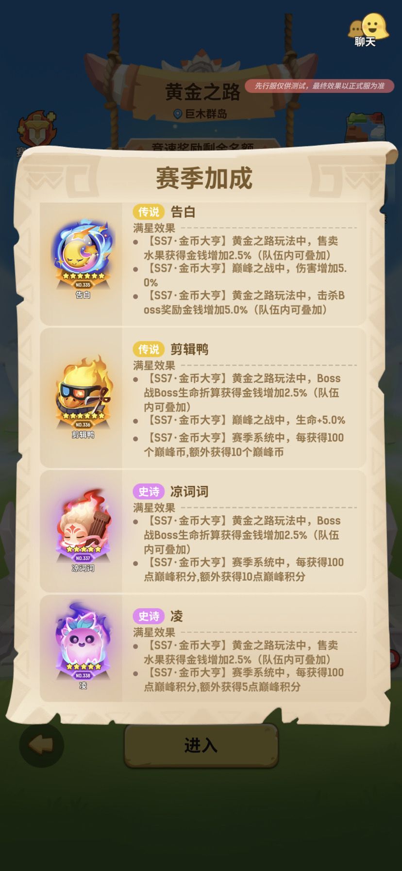 赛季专属英魂效果如上图,s7赛季黄金之路通关方式是累积卖出金币达到关卡规定数额,有卖水果和打boss两种核心模式。想要参与竞速首先就是要待全队成员获取激活四个赛季英魂后开始扔骰子。(英魂效果队伍可叠加,且核心词条“获得金钱增加XXX”拥有即可,升星不增加)