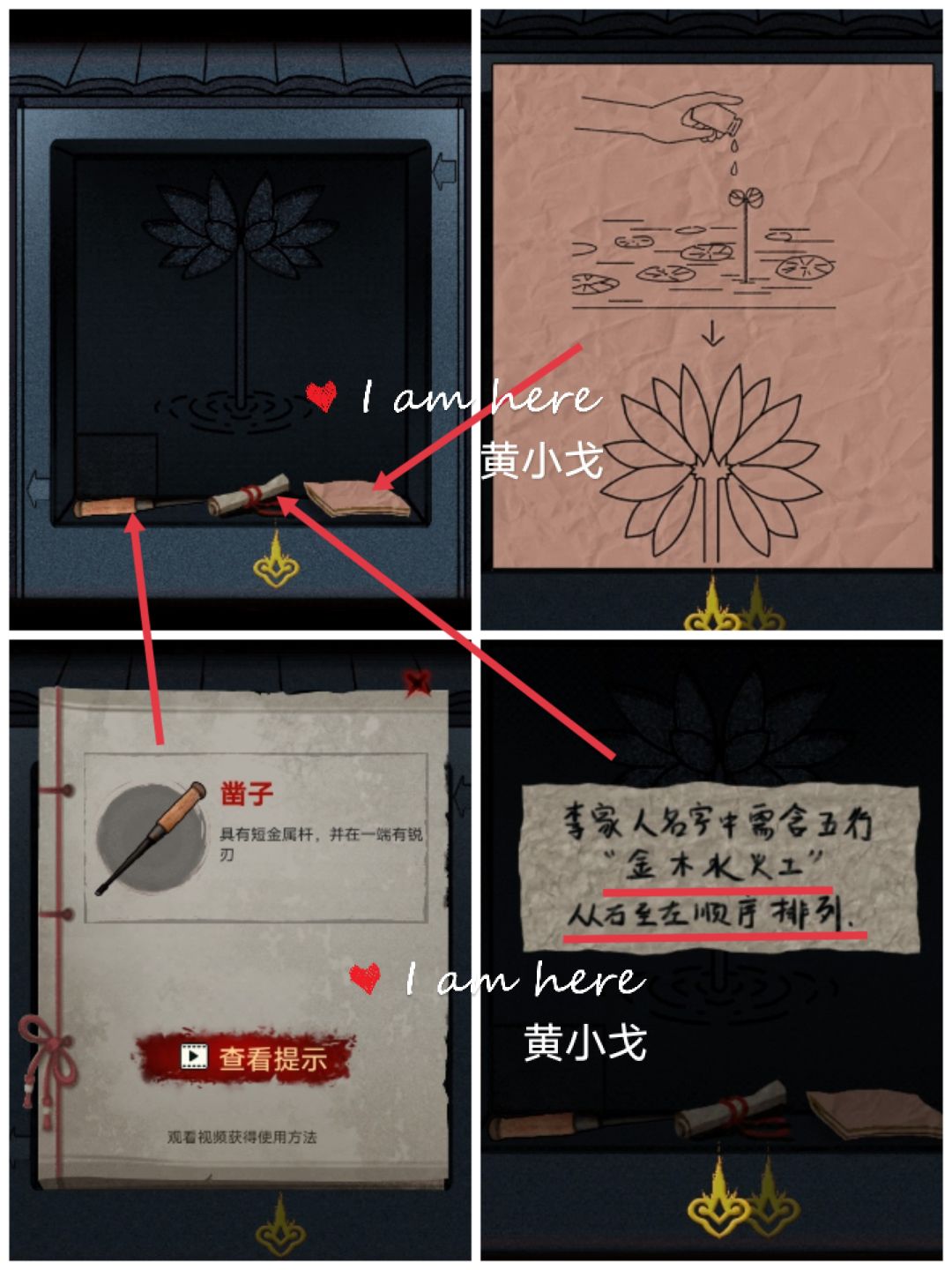 8.暗格打开,获得【凿子】,查看两张纸上的内容(李家人名字含五行:金木水火土,从右至左顺序排列)