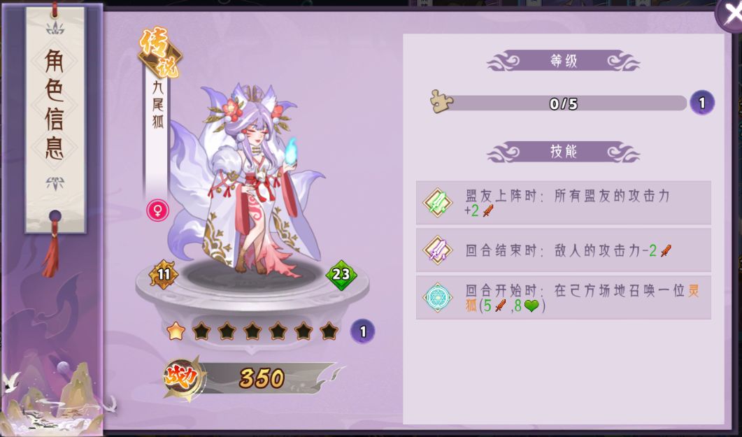 1. 【九尾狐】当盟友上阵时,可对所有盟友增加攻击力。自身每回合还可召唤一只灵狐。