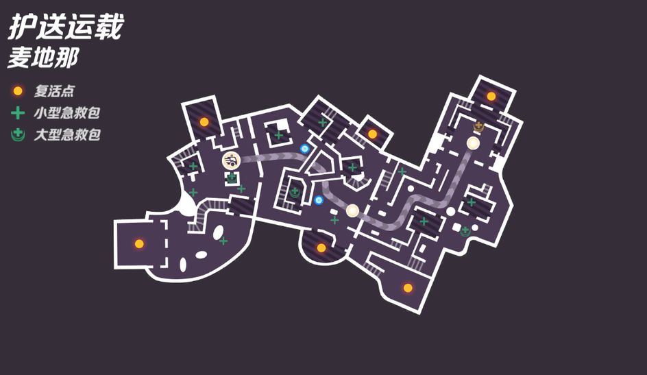- 麦地那是一张护送地图,进攻方需要先进攻目标点(A点),然后护送运载目标,护送经过检查点(B点)并到达终点(C点)获得胜利。