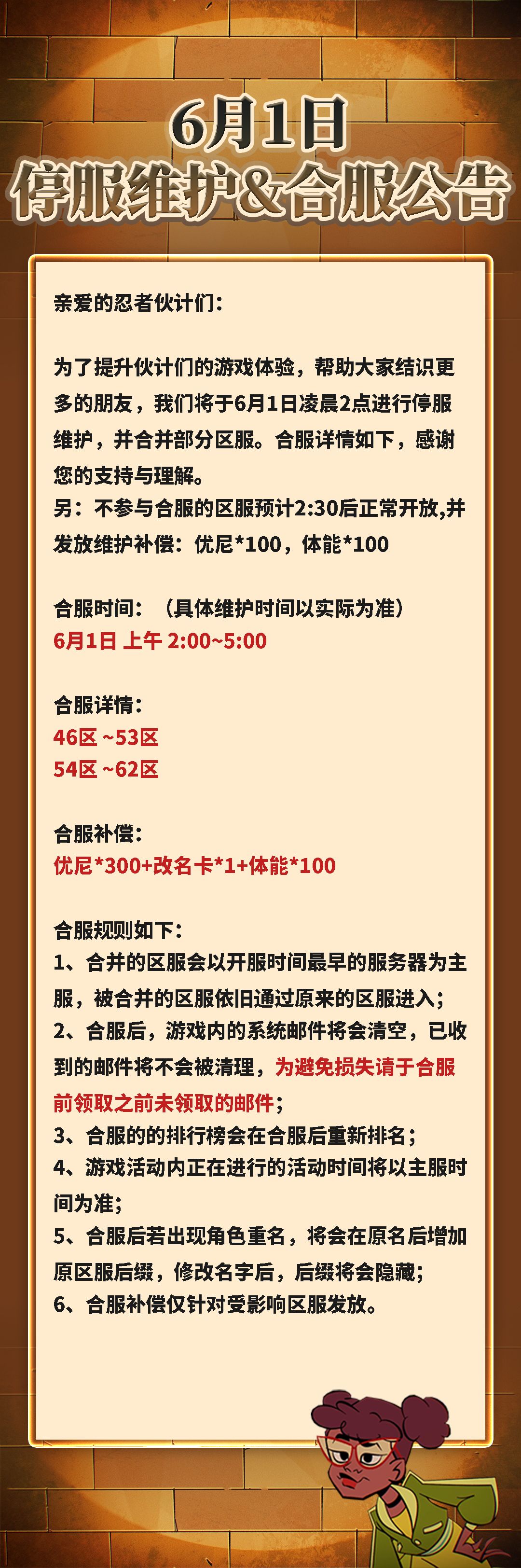 为了提升伙计们的游戏体验,帮助大家结识更多的朋友,我们将于6月1日凌晨2点进行停服维护,并合并部分区服。合服详情如下,感谢您的支持与理解。