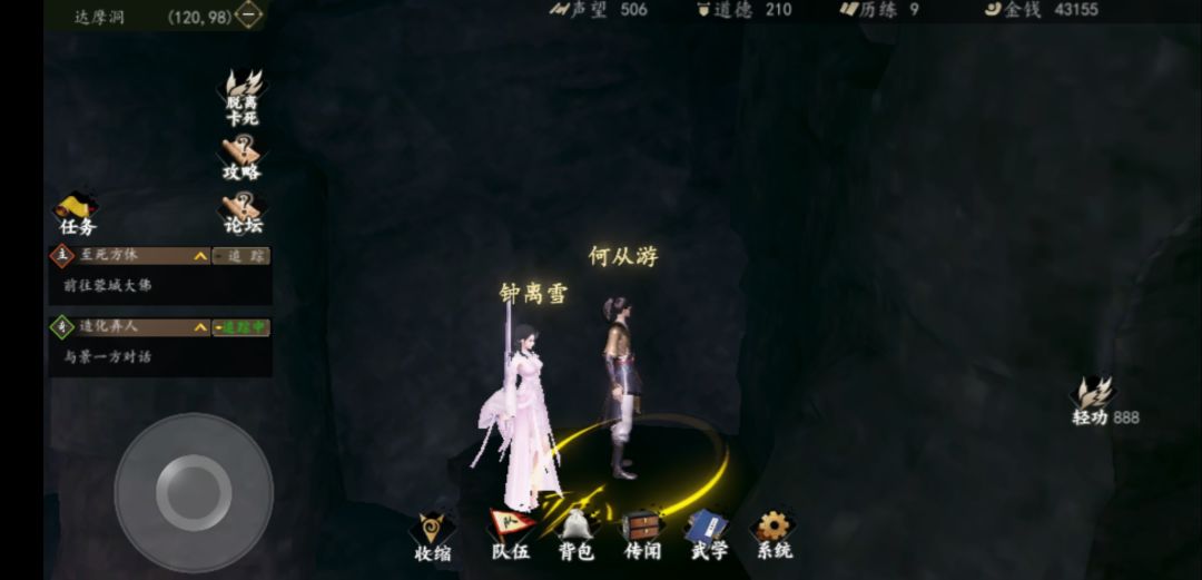 重点来了,集齐这三门且升级至最高级后,去少林禁地(要先打扫地僧),然后跳墙至下图(注意坐标),墙上有高僧心得,需要悟性90后,三合一习得九阳。