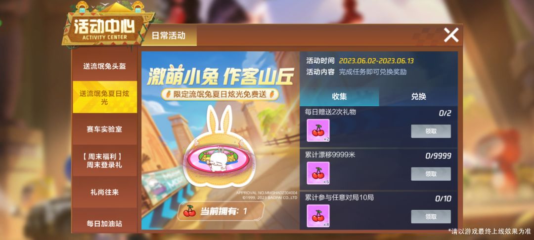 悦动的小兔跳跃在身周,这个夏日不再孤单~6月2日起,完成指定任务收集樱桃碎片,集齐对应数量樱桃碎片即可兑换【流氓兔夏日炫光】、酷币!