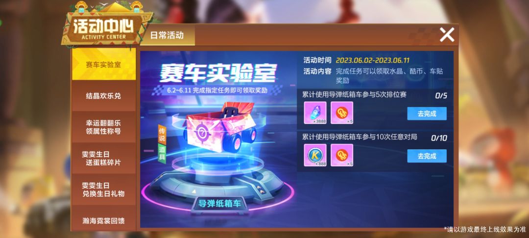 赛车实验室里除了可以体验到各种各样的强力赛车以外,累计体验指定次数还可获得专属导弹纸箱车贴、能量水晶、酷币!