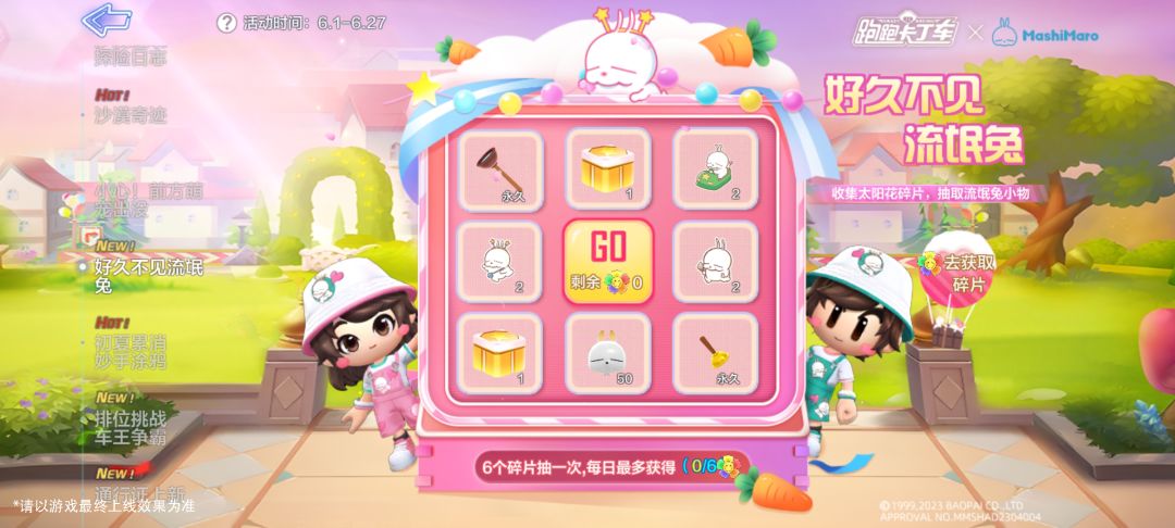 每次消耗6个太阳花碎片即可参与活动抽奖,流氓兔粉丝女套装(永久)、流氓兔粉丝男套装(永久)、流氓兔的马桶塞、黄金马桶塞、流氓兔限定车贴等你抽取!