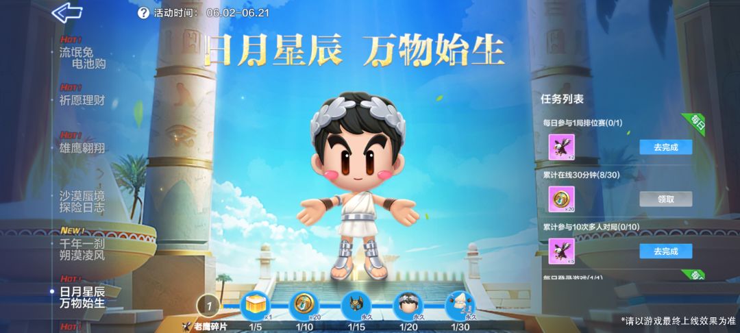 日月星辰催生万物,文明长河奔流不息。6月2日起,完成指定任务领取老鹰碎片,累计足够数量的碎片即可解锁全新【古埃及套装服】(男)、【古埃及套装帽】(男)、阿努比斯面饰、探险金币!