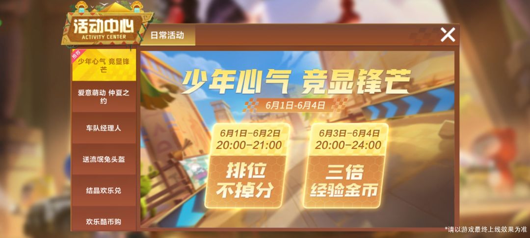 热血年少,青春不老!6月1日-6月2日20:00-21:00,排位不掉分buff开启,尽情冲刺放肆漂移~