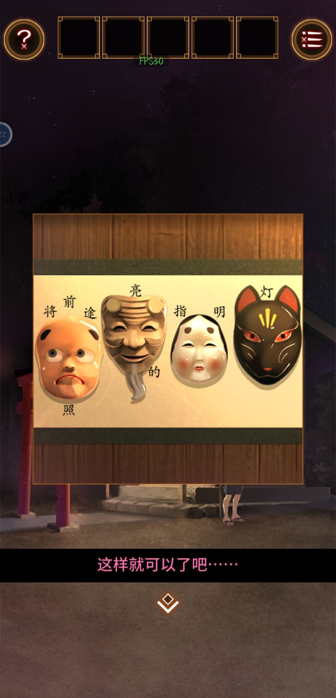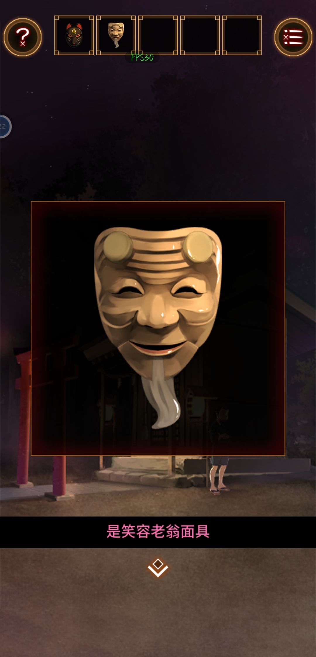 火男面具→笑翁面具→阿龟面具→黑狐面具