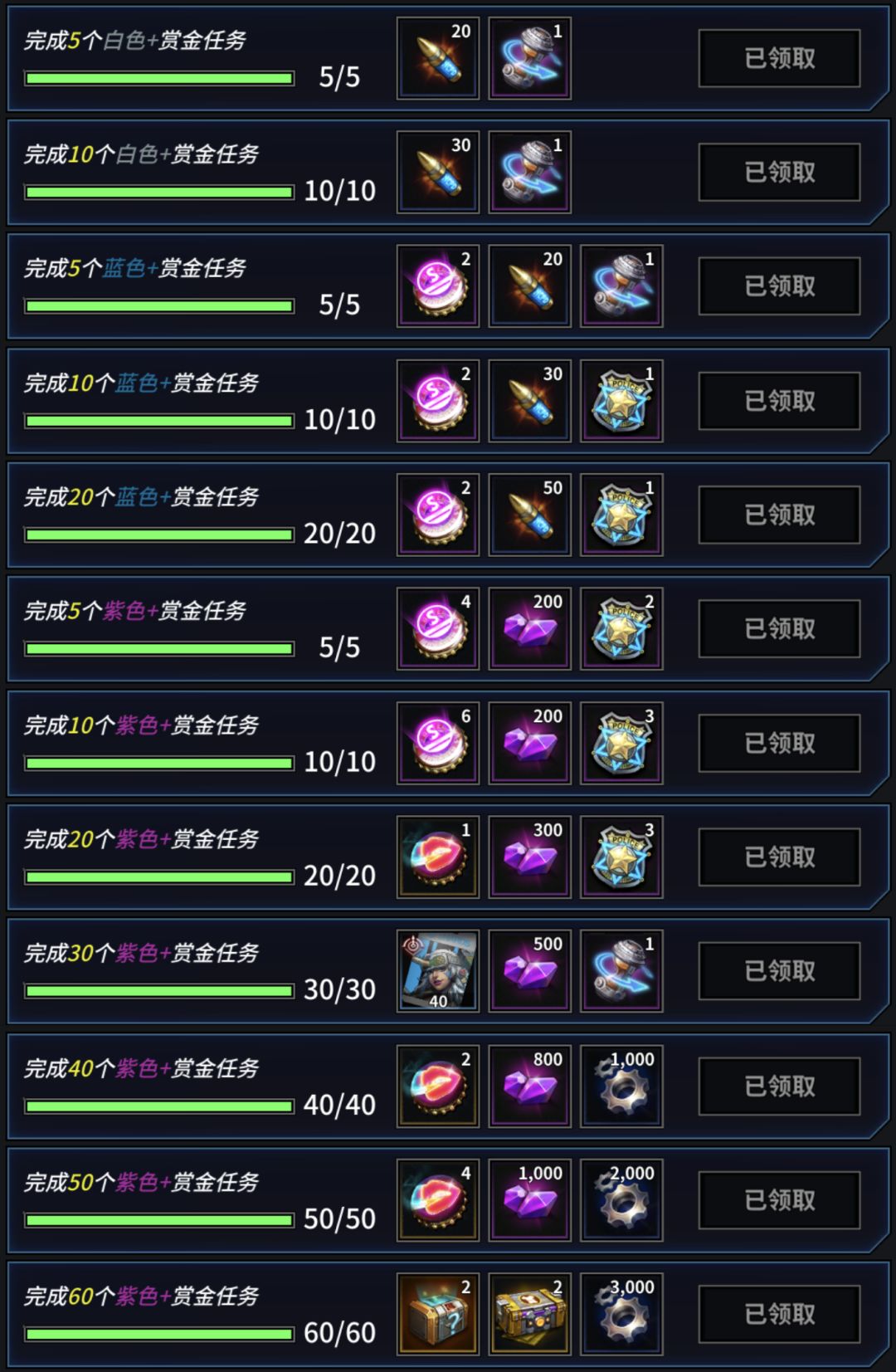 玩家一般会有两个目标:完成紫色任务的数量达到“50档”或“60档”;以及,获得200手铐(单专武)或获得400手铐(双专武)。有时会考虑多拿一些手铐来兑换精炼币、重铸纽扣和红唇。