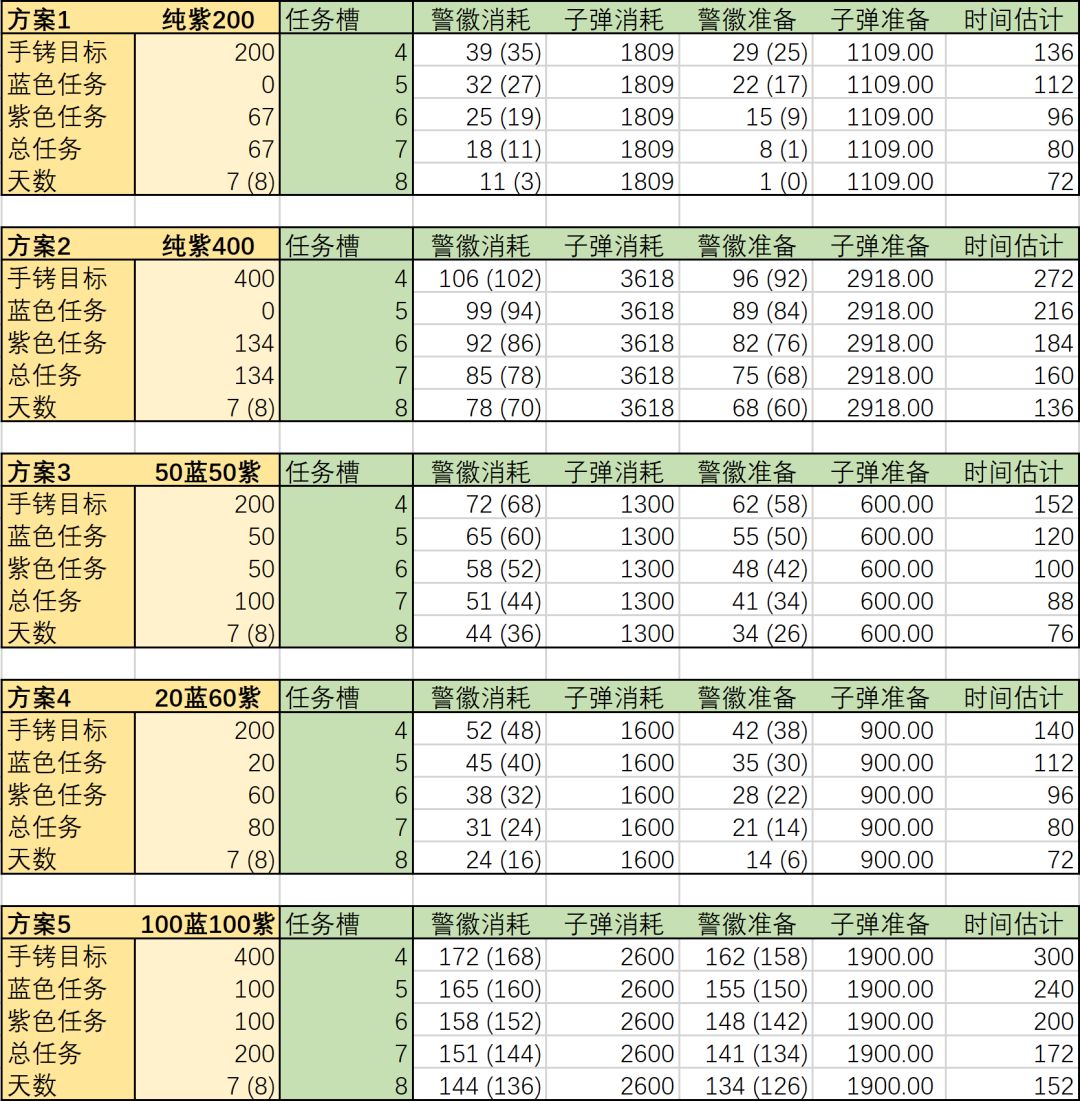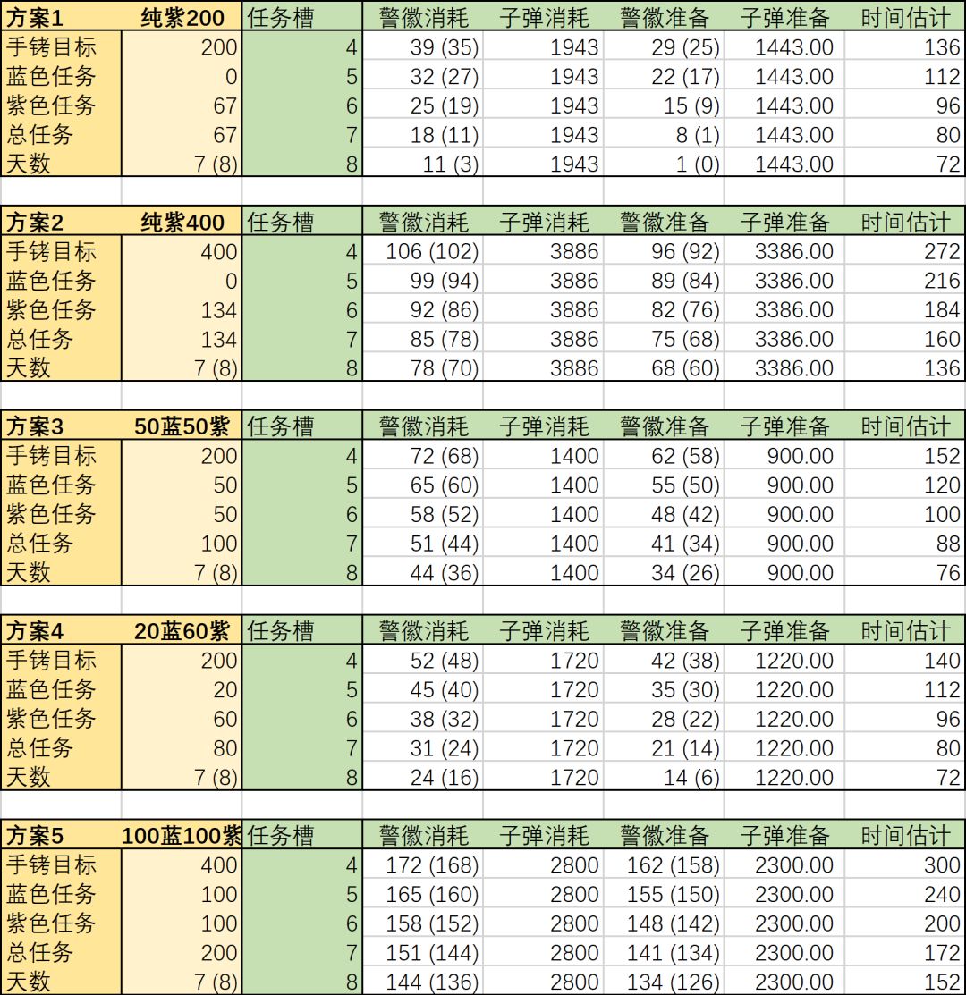 玩家调整完后应该要重新估计一下子弹和警徽的消耗,还有时间是否能准时做完。计算方法请参考下节。个别情况下,如果子弹紧张但警徽较多,可以稍多做一点蓝色;如果子弹较多但警徽紧张,可以做多点紫色。这些大家做了多了就会有一套属于自己的经验化的调整方案。请灵活应对。最后,一般情况下,增加蓝色减少紫色会增加完成时间,务必要注意时间。