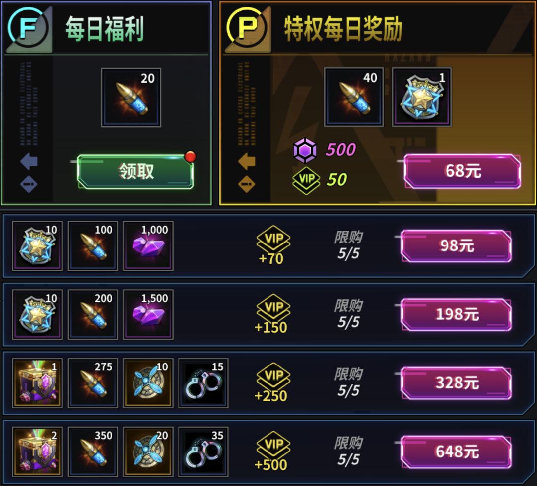 礼包性价比低,高氪玩家可以考虑。周卡较为平民,可以加速新手玩家尽快进入“活动的良性循环”,或者让氪金玩家增加手铐获取,兑换更多奖励。没有购买周卡的玩家也可以在7天活动期内,每天免费领取20子弹。购买周卡可以额外每天领取40子弹和1枚警徽。周卡在活动期内任何时段都可以购买,之前没有领取的奖励会在下一次领取时一起给出。活动结束没有领取的会邮寄给玩家。