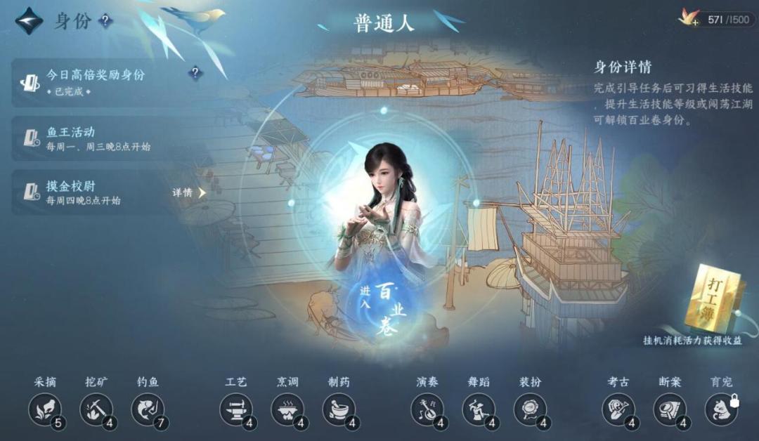 目前游戏当中一共有采摘、挖矿、钓鱼、工艺、烹调、制药、演奏、舞蹈、装扮、考古、断案、育宠十二个大类的身份。参与身份玩法,都需要消耗活力值。在每个身份当中,都还有其他的特定身份。玩家们需要通过参与身份玩法、积累对应身份经验提升等级来解锁高等级的身份。需要注意的是,《逆水寒手游》当中的身份系统并不是只能游玩一种,所有的身份玩家都可以游玩,因此只要玩家们有时间愿意体验这些玩法,各种身份都是有机会能够玩到的。