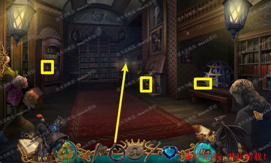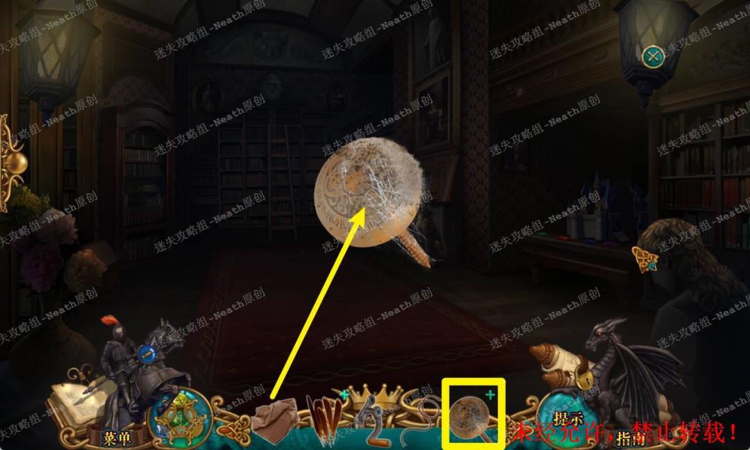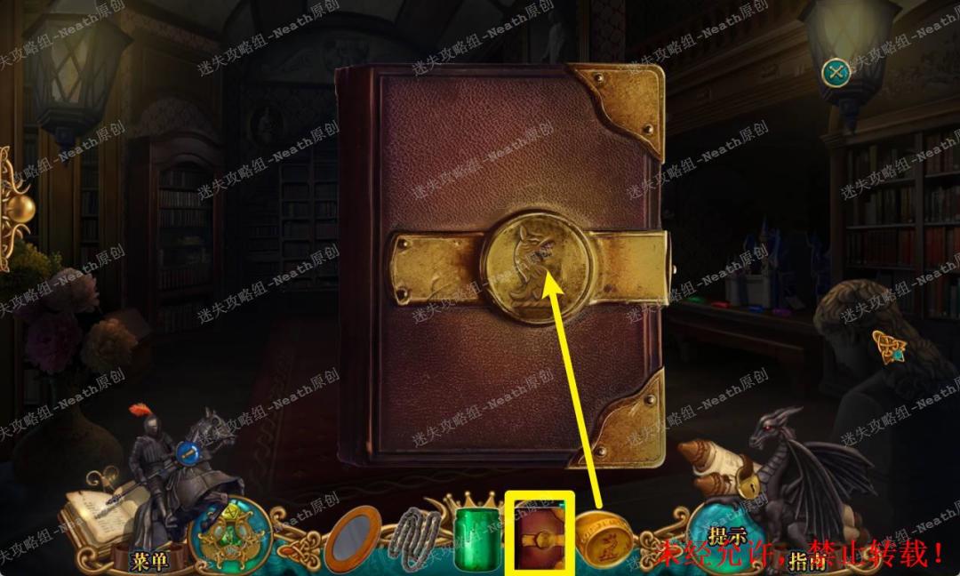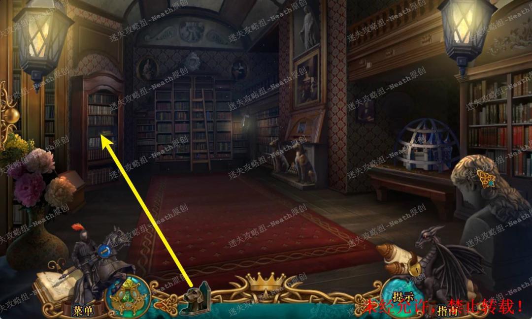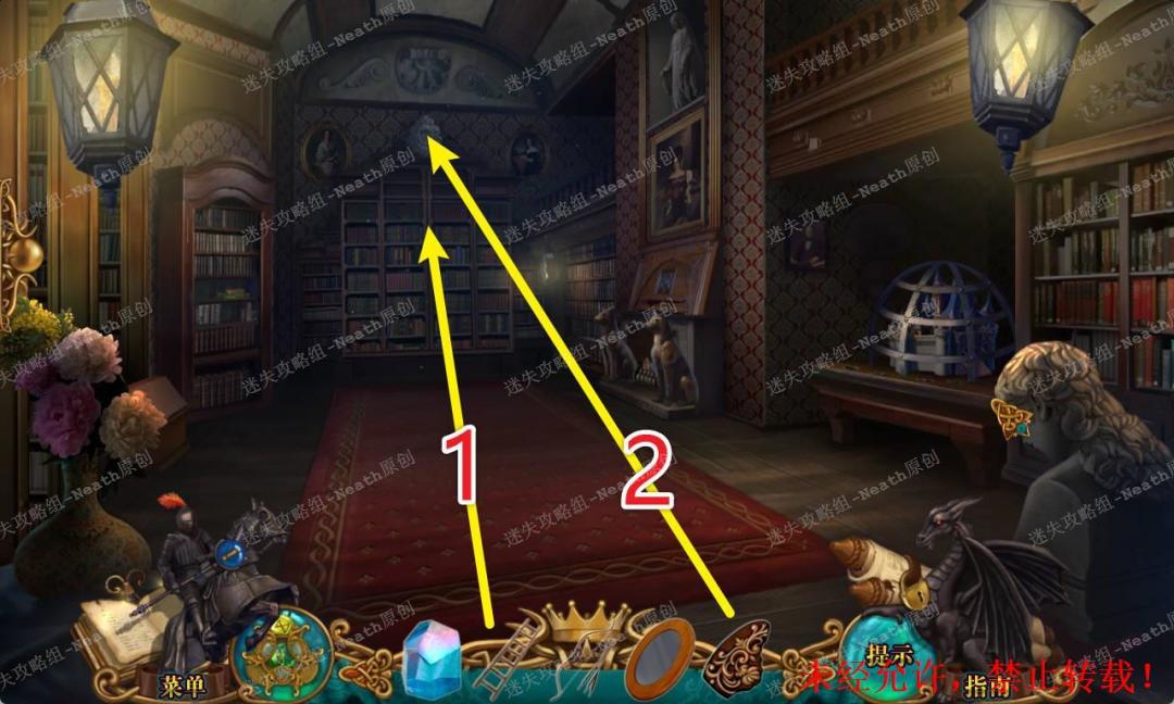 110、返回图书馆,把【梯子】搭在书架上,使用【纹章碎片】补全纹章,拿走【书挡】和【星形紫水晶】。110