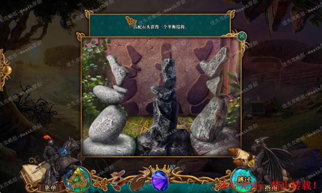 138、回到湖岸,把【黑石】和【大理石】放到左边石碑旁边,进入小游戏,把石堆搭成背景的样子即可,完成后拿走【魔法项圈】。138 138.1