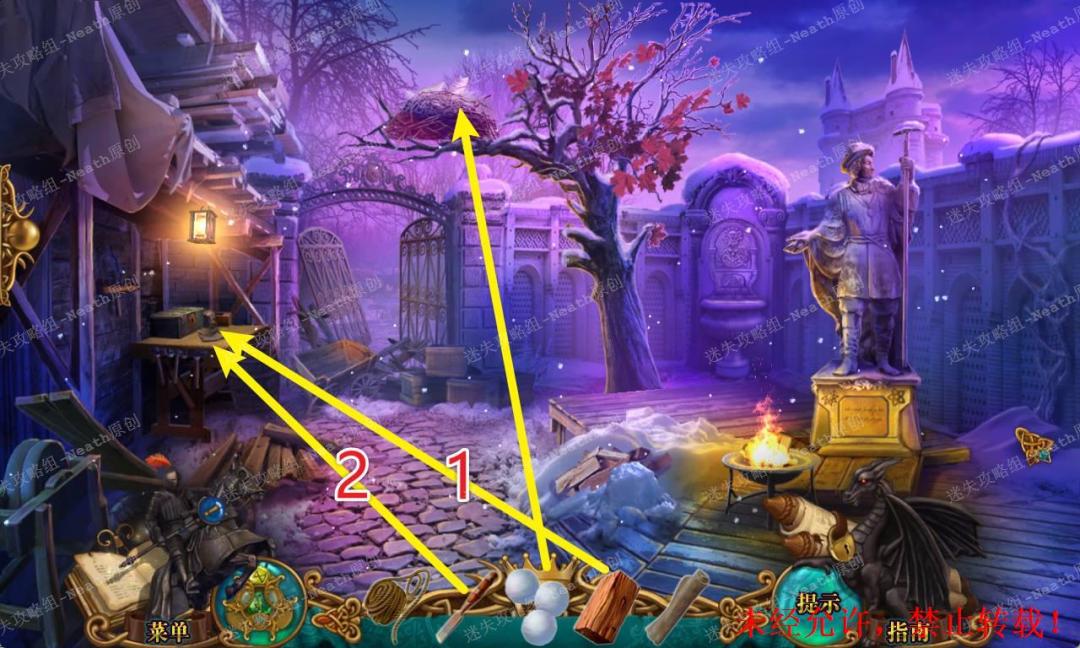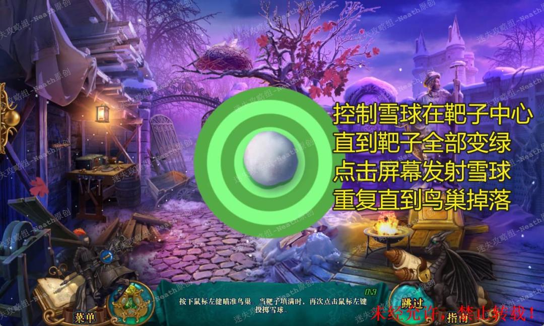 77、把【木块】放到左边桌子上,使用【凿子】,凿出【木把手】,对鸟巢使用【雪球】进入小游戏,控制雪球在靶子中心,直到靶子全部变绿,点击屏幕发射雪球,重复直到鸟巢掉落,在鸟巢里拿走【灯阀门】和【独眼猫头鹰】。77 77.1