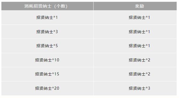 活动期间,累计消耗一定数值的「招贤纳士」将可以获得对应数量的「招贤纳士」。