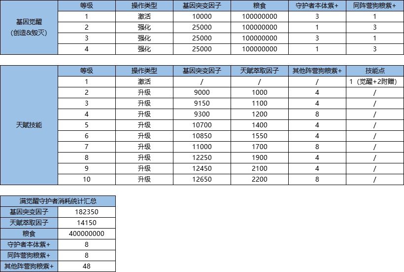 基因觉醒激活材料以及天赋技能激活材料详看以下表格内容