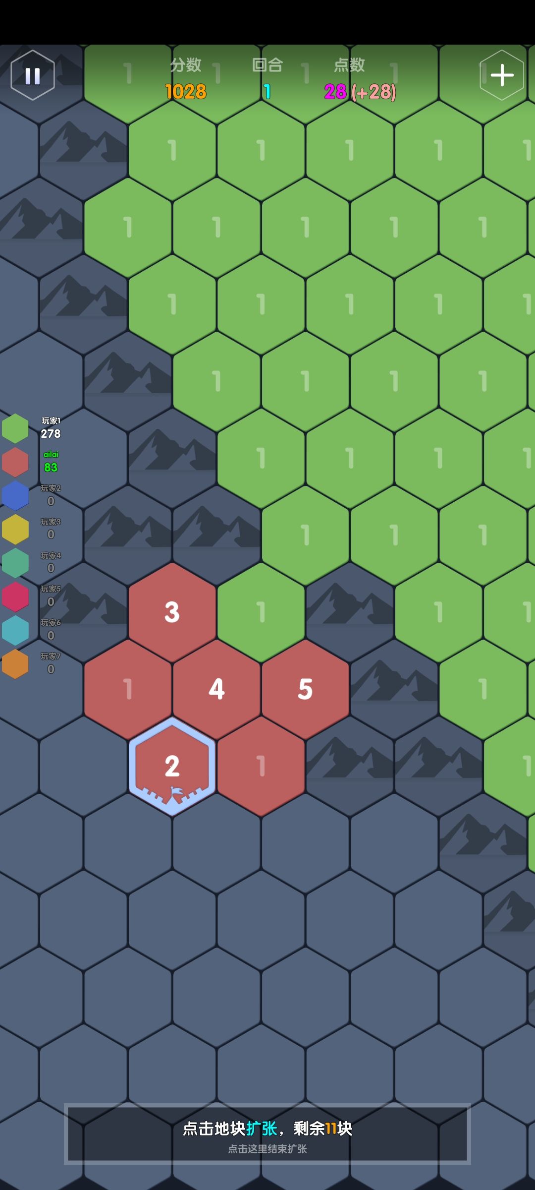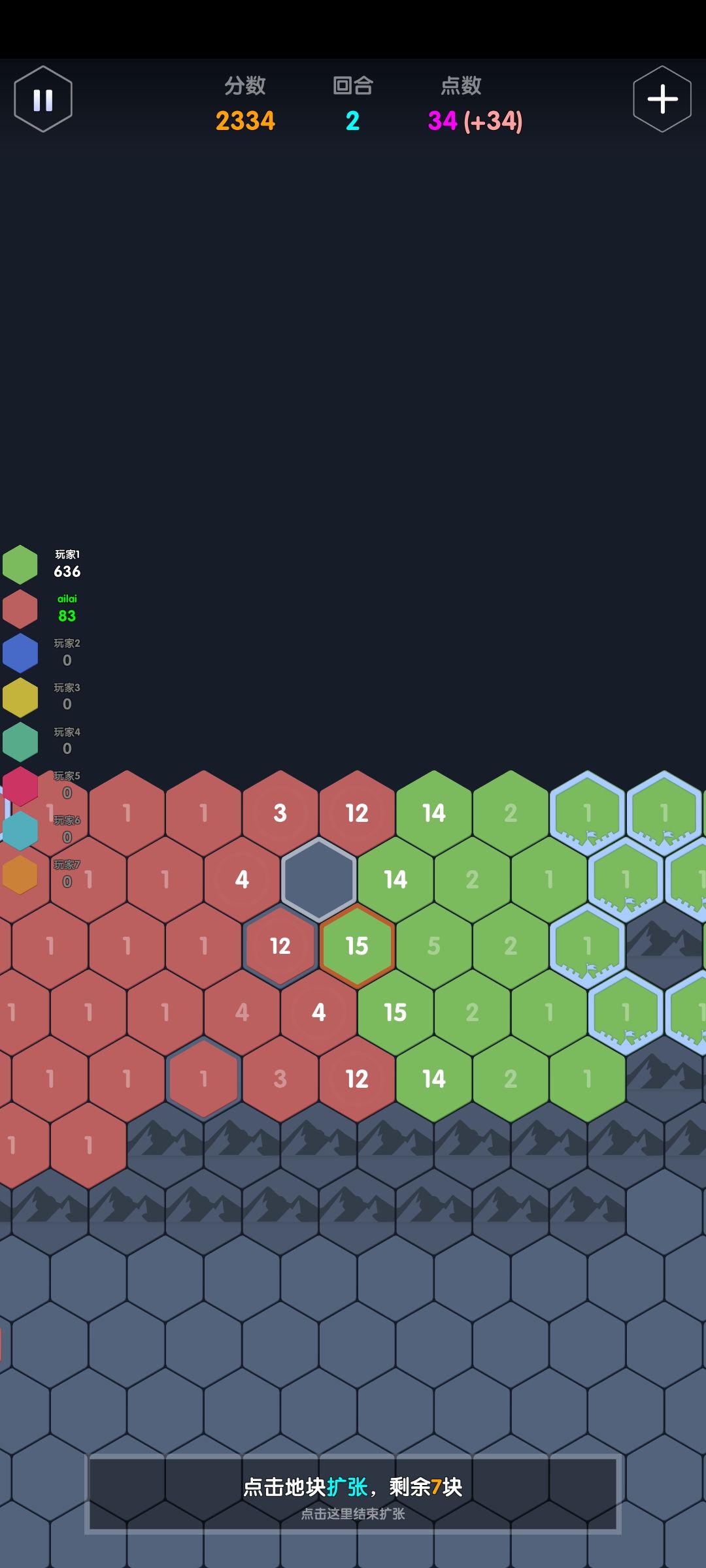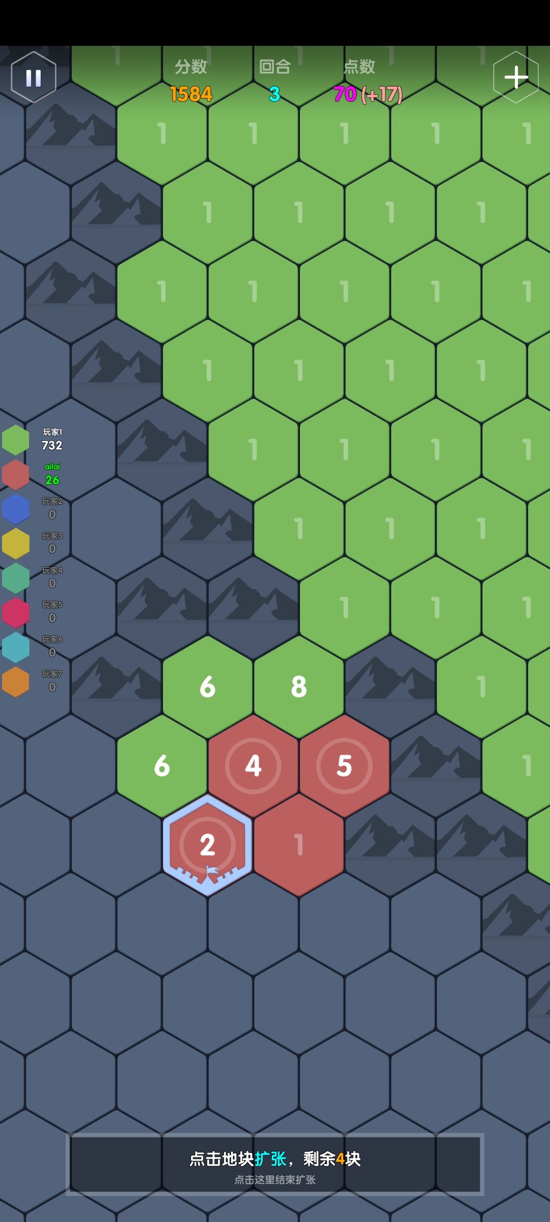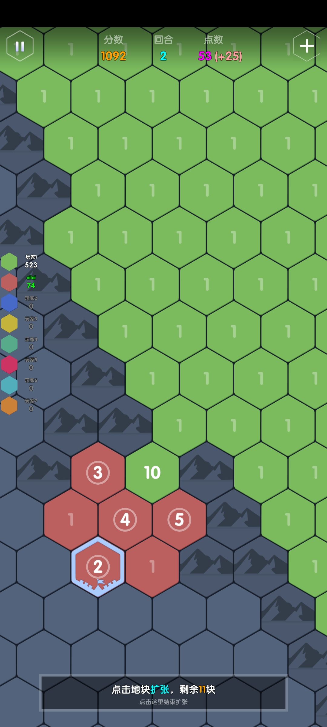 举例:一个点数充足的ai,接壤了点数分别为3,4,5的地块,那它会加到几?答案是这三格的合击+1:2+3+4+1=10